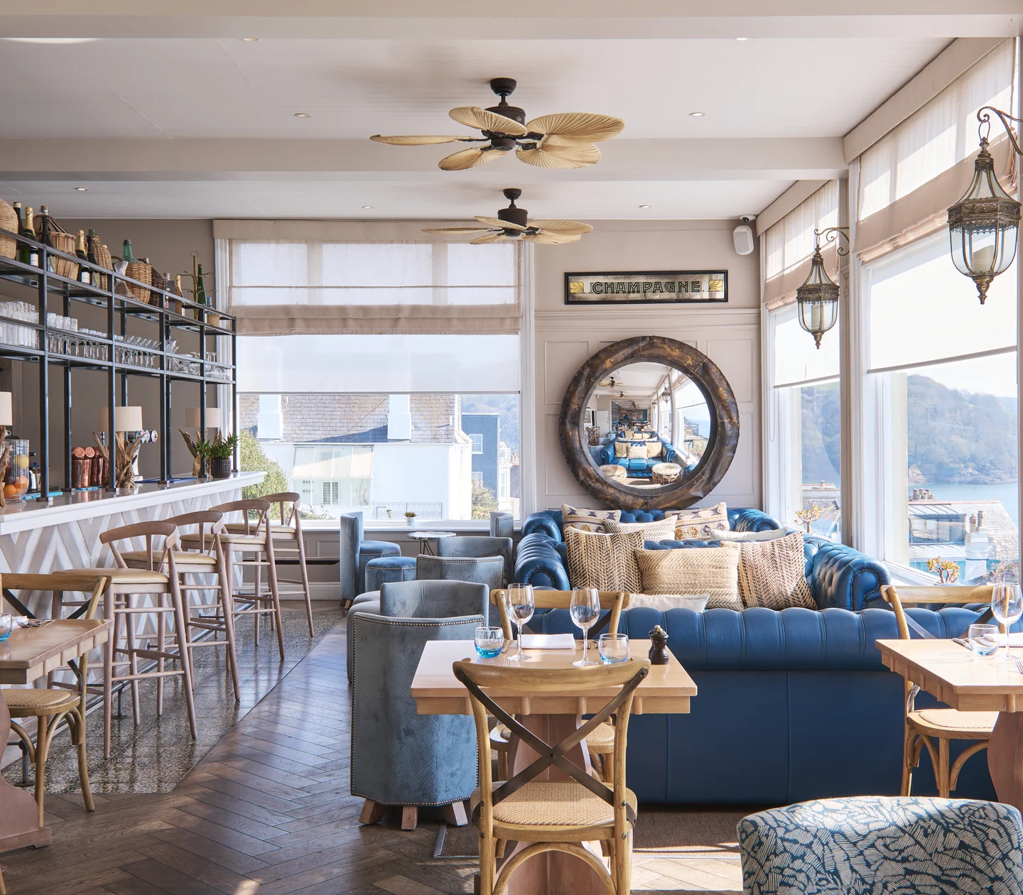 Our atmospheric bar flows seamlessly from restaurant to terrace to mesmerising estuary views. Enjoy creations by our mixologists amid blue leaf-print wallpaper, rattan chairs and plush sofas—a nod to Fowey’s rich history of exotic world travel.