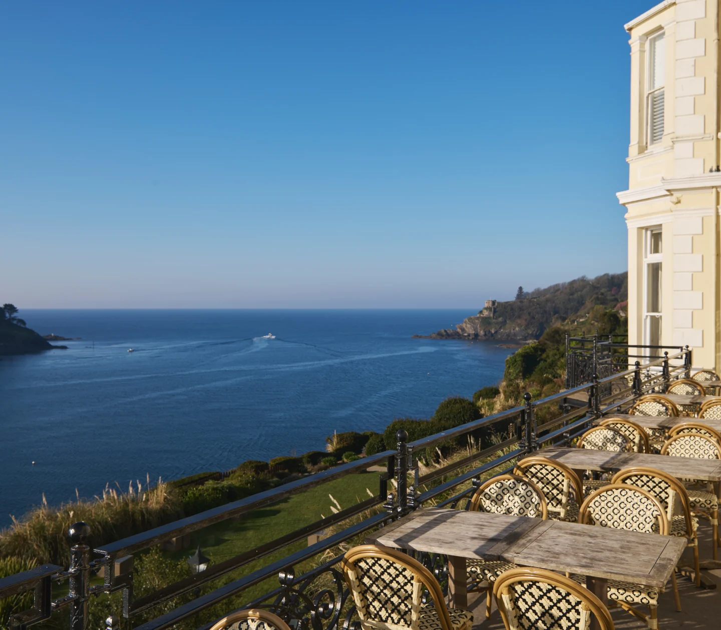 Perched above the town, enjoy drinks and fresh sea air with a sophisticated and relaxed atmosphere. Take to the terrace or the lower gardens for a Cornish afternoon tea, or savour local cocktails and wines, as well as local craft beers and gins.