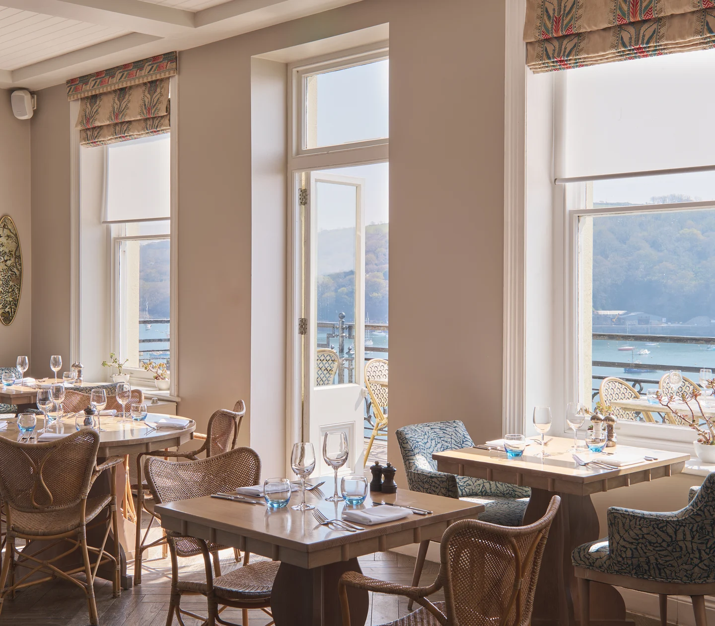 Our atmospheric bar flows seamlessly from restaurant to terrace to mesmerising estuary views. Enjoy creations by our mixologists amid blue leaf-print wallpaper, rattan chairs and plush sofas—a nod to Fowey’s rich history of exotic world travel.