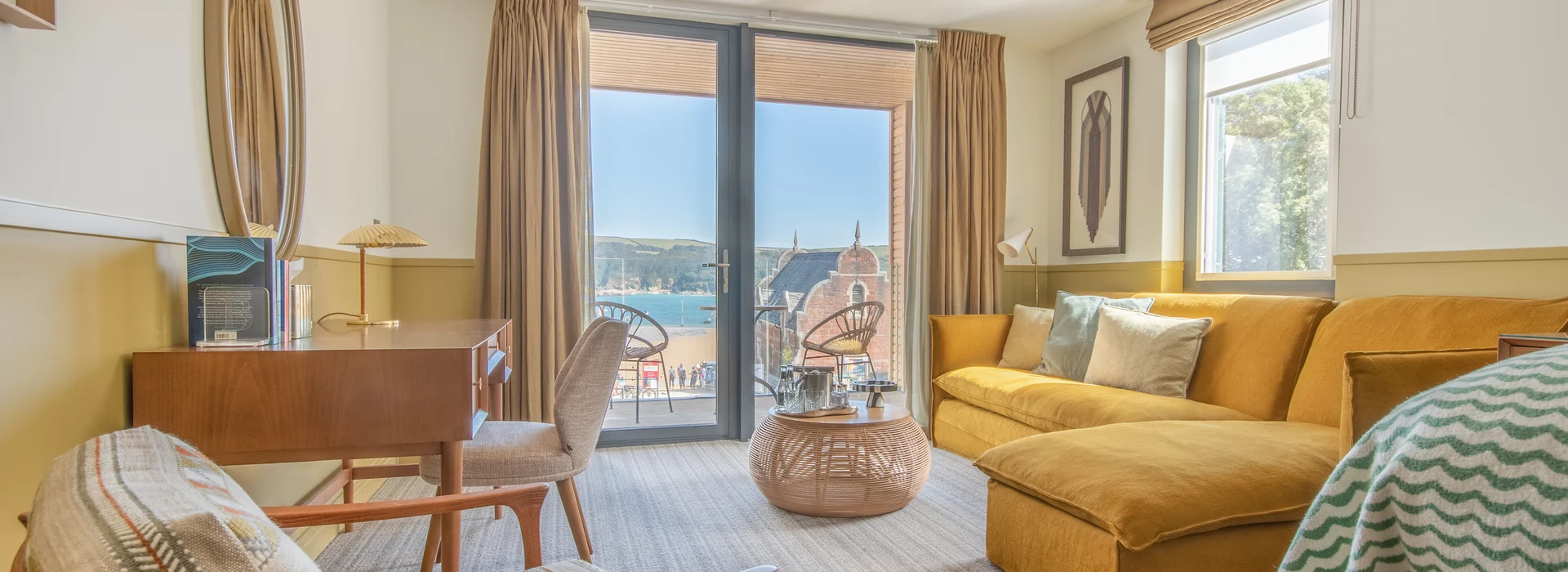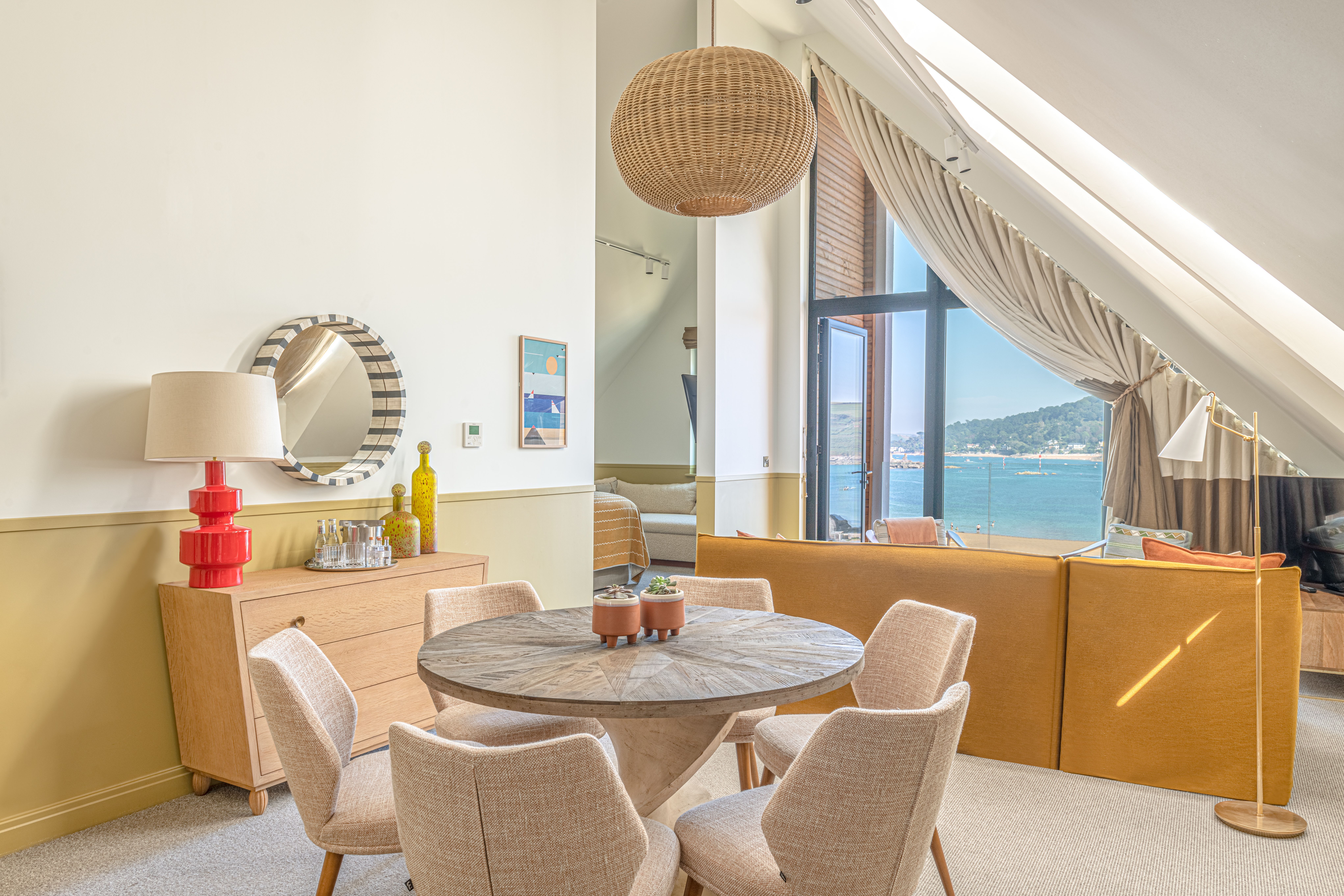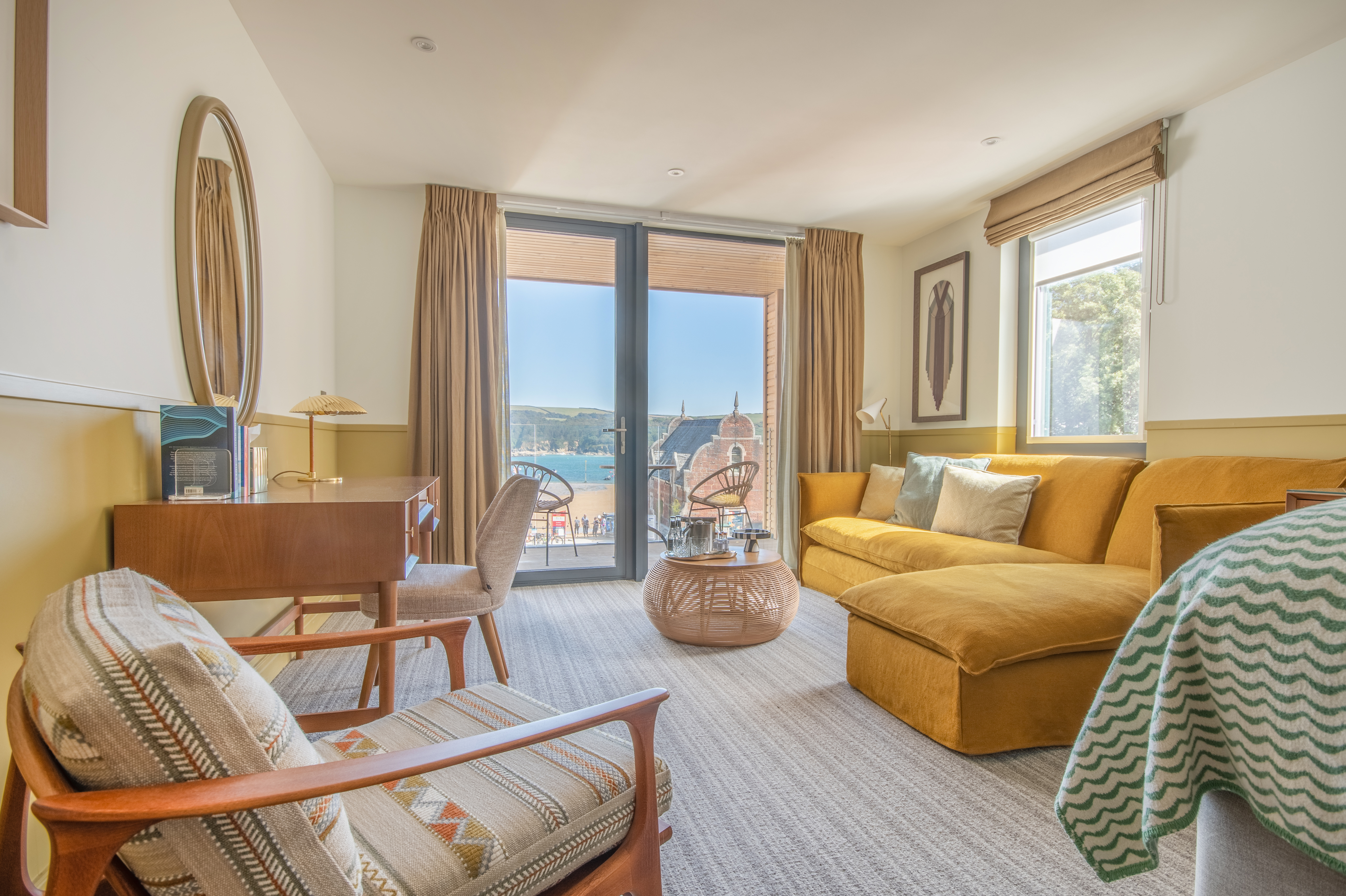 The location was hugely influential. Using colours from the natural surroundings, we wanted different elements of the hotel to reflect its captivating land and sea – Salcombe’s coastal views and rolling countryside are outstanding. We ended up with a colour palette made up of earthy and sienna tones as well as ochre yellows, sea blues and sage greens. The furniture is relaxed and versatile, with tactile materials and soft fabrics ensuring all surfaces feel like an invitation to slow down and recharge. The result is a ‘barefoot luxury’ resort that connects the inside with the outside seamlessly, featuring aspects that work well for both the winter and summer months.
