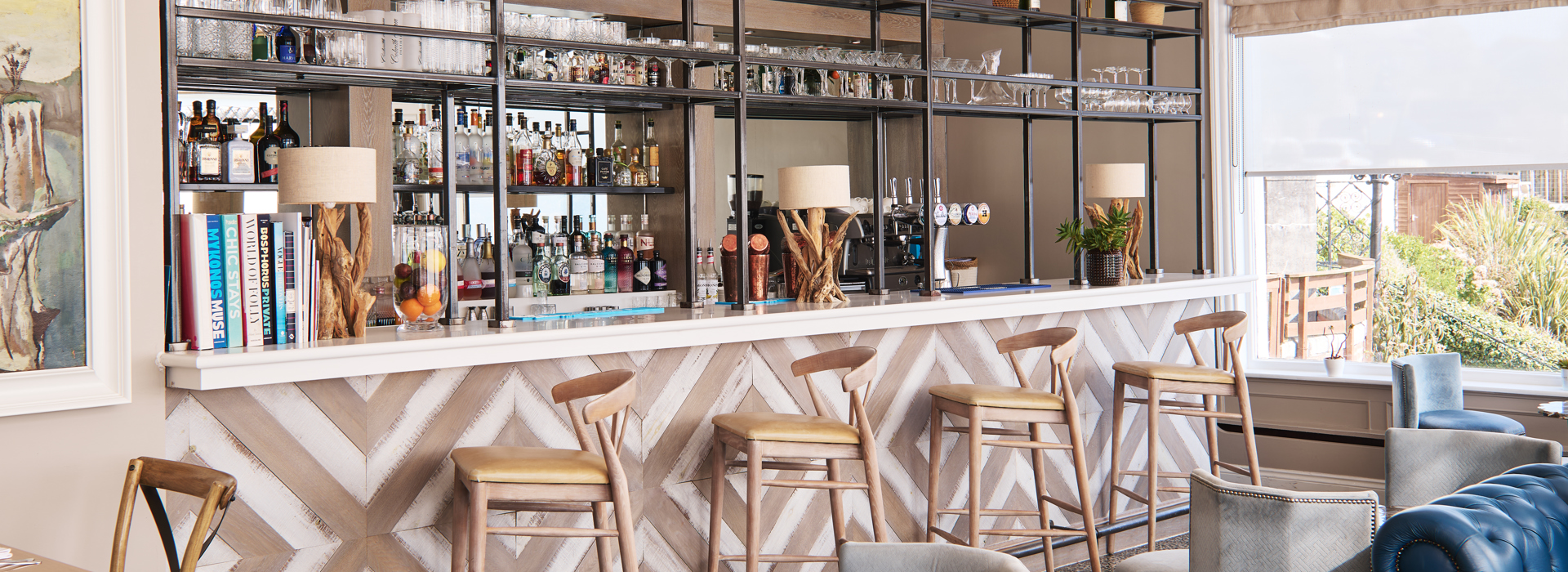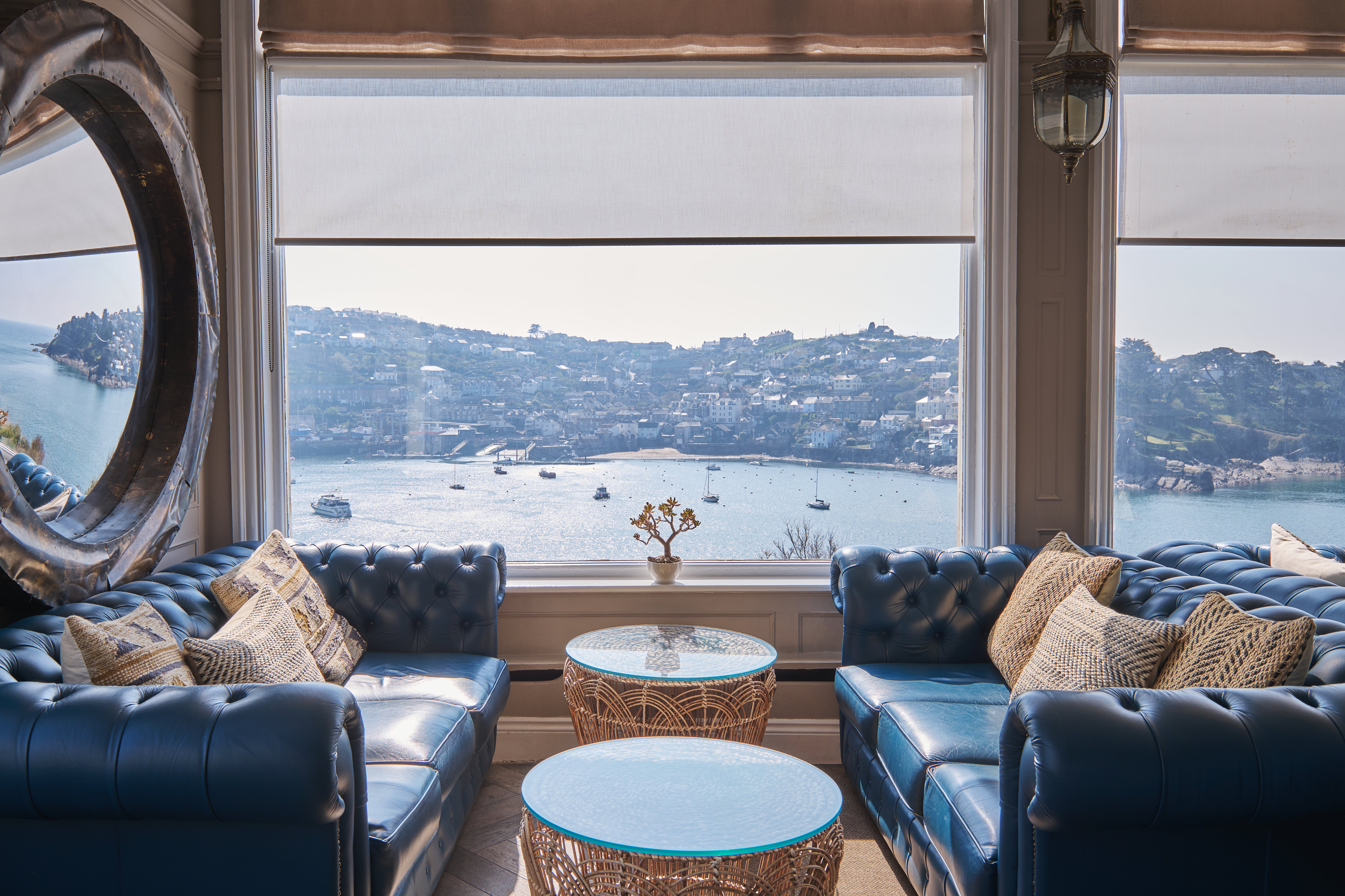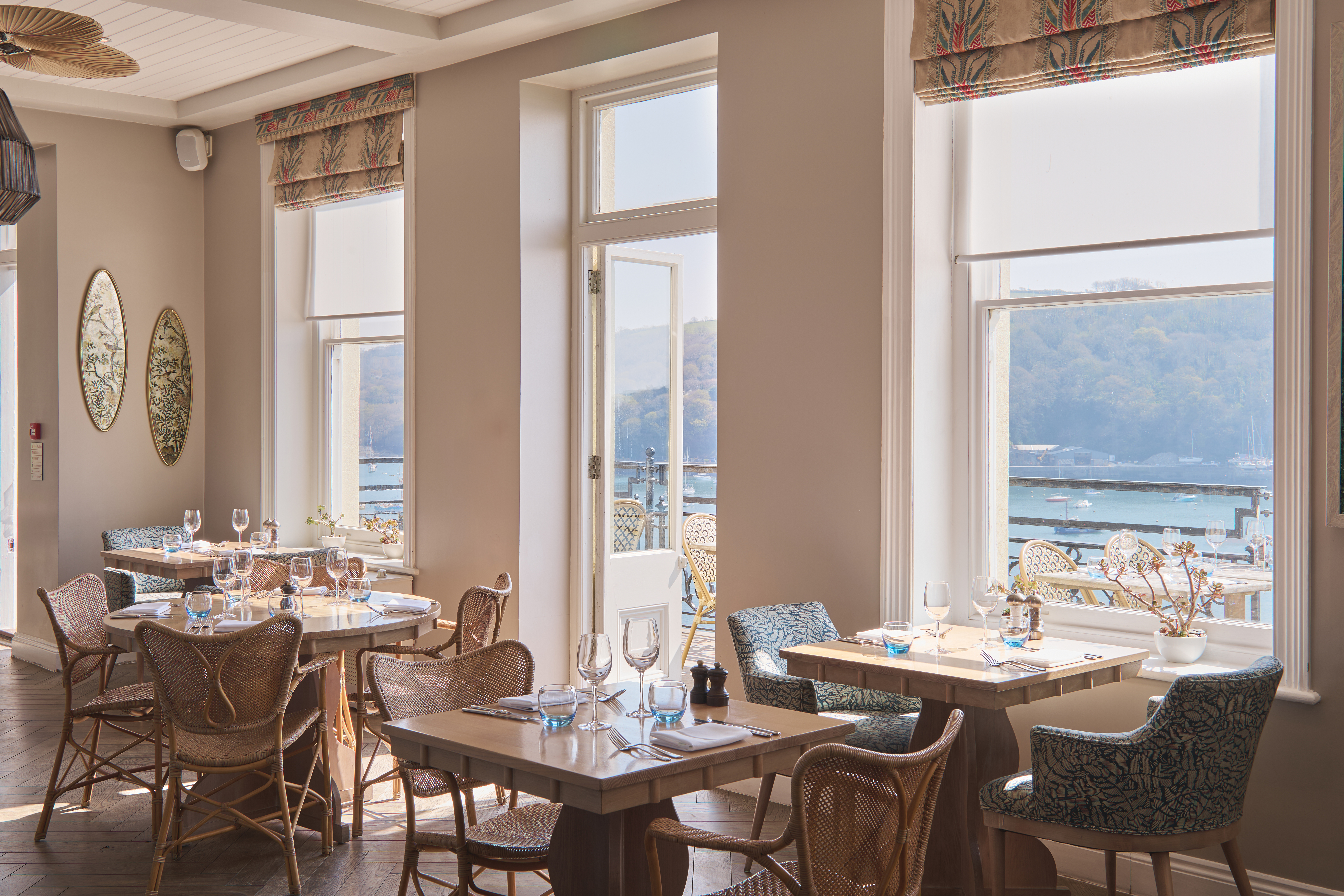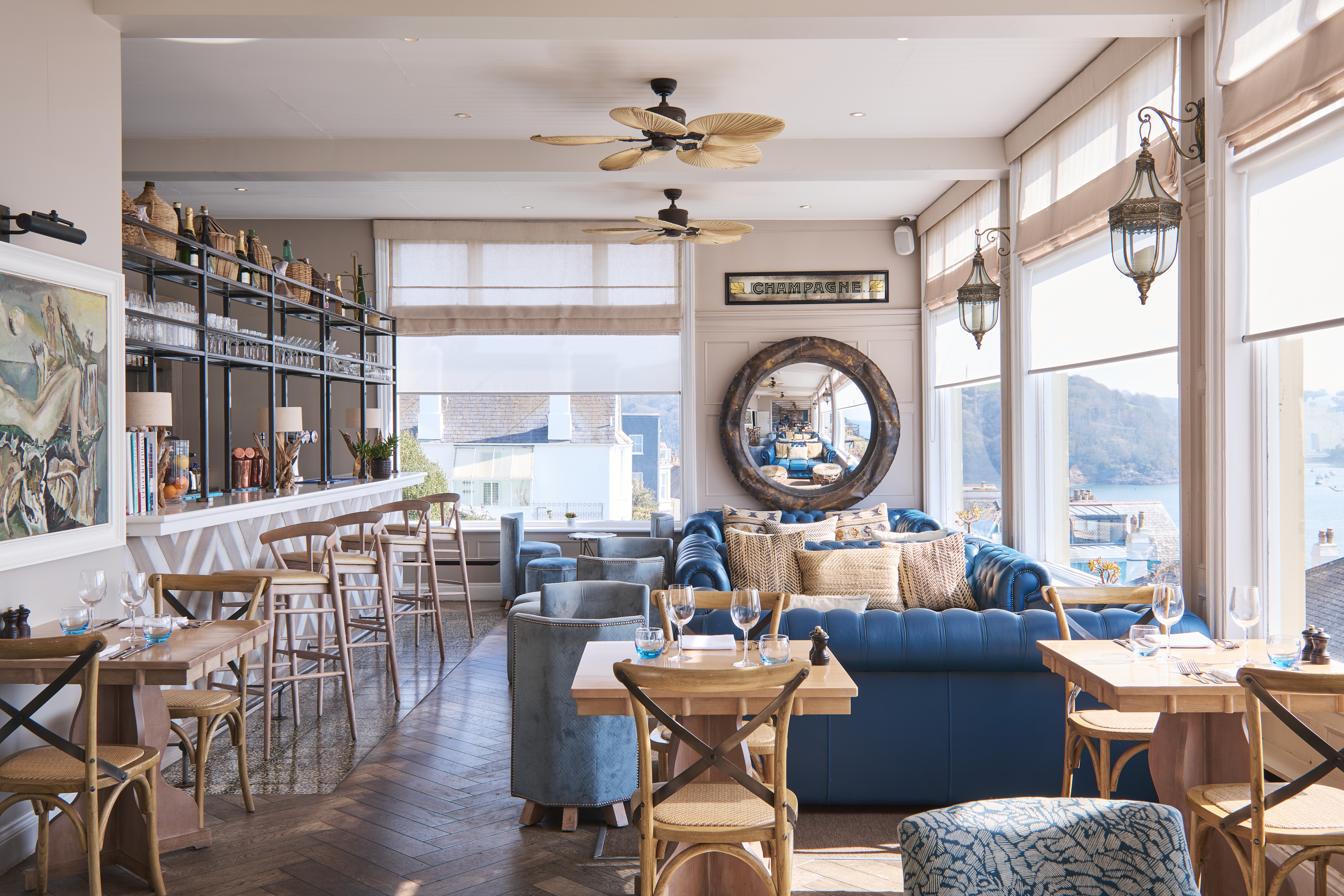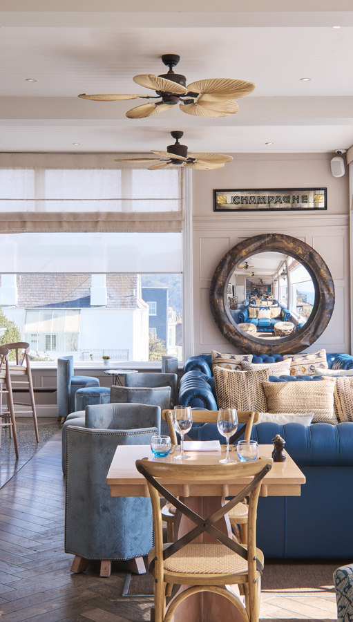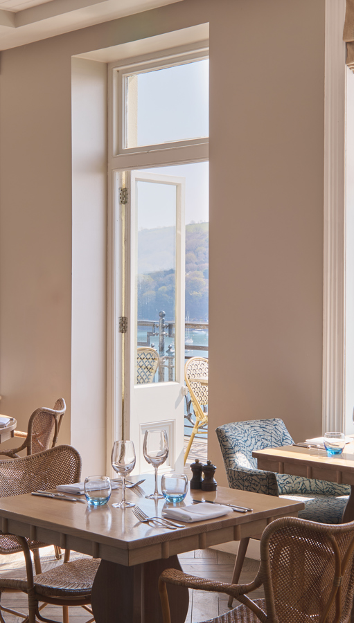 Our atmospheric bar flows seamlessly from restaurant to terrace to mesmerising estuary views. Enjoy creations by our mixologists amid blue leaf-print wallpaper, rattan chairs and plush sofas—a nod to Fowey’s rich history of exotic world travel.