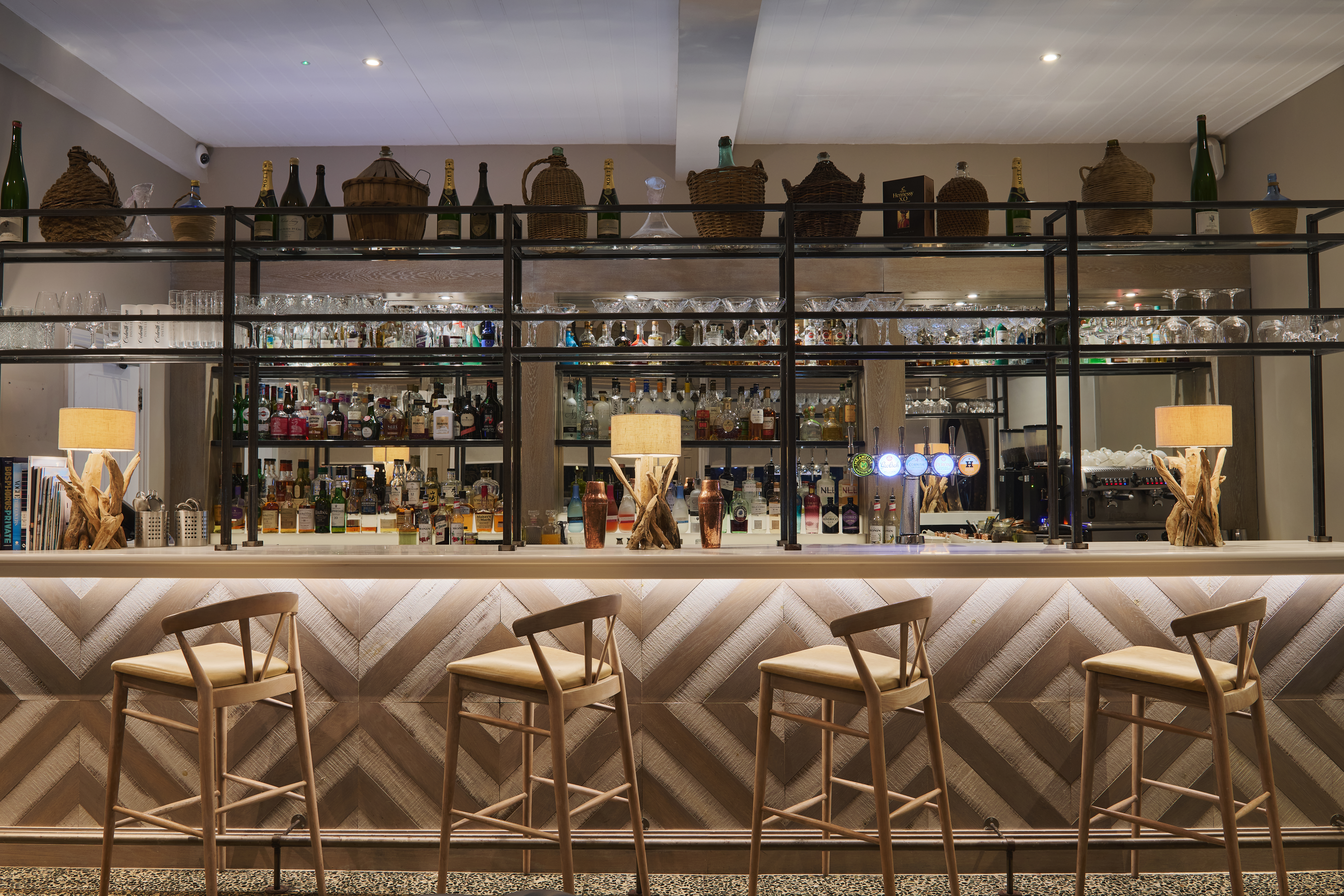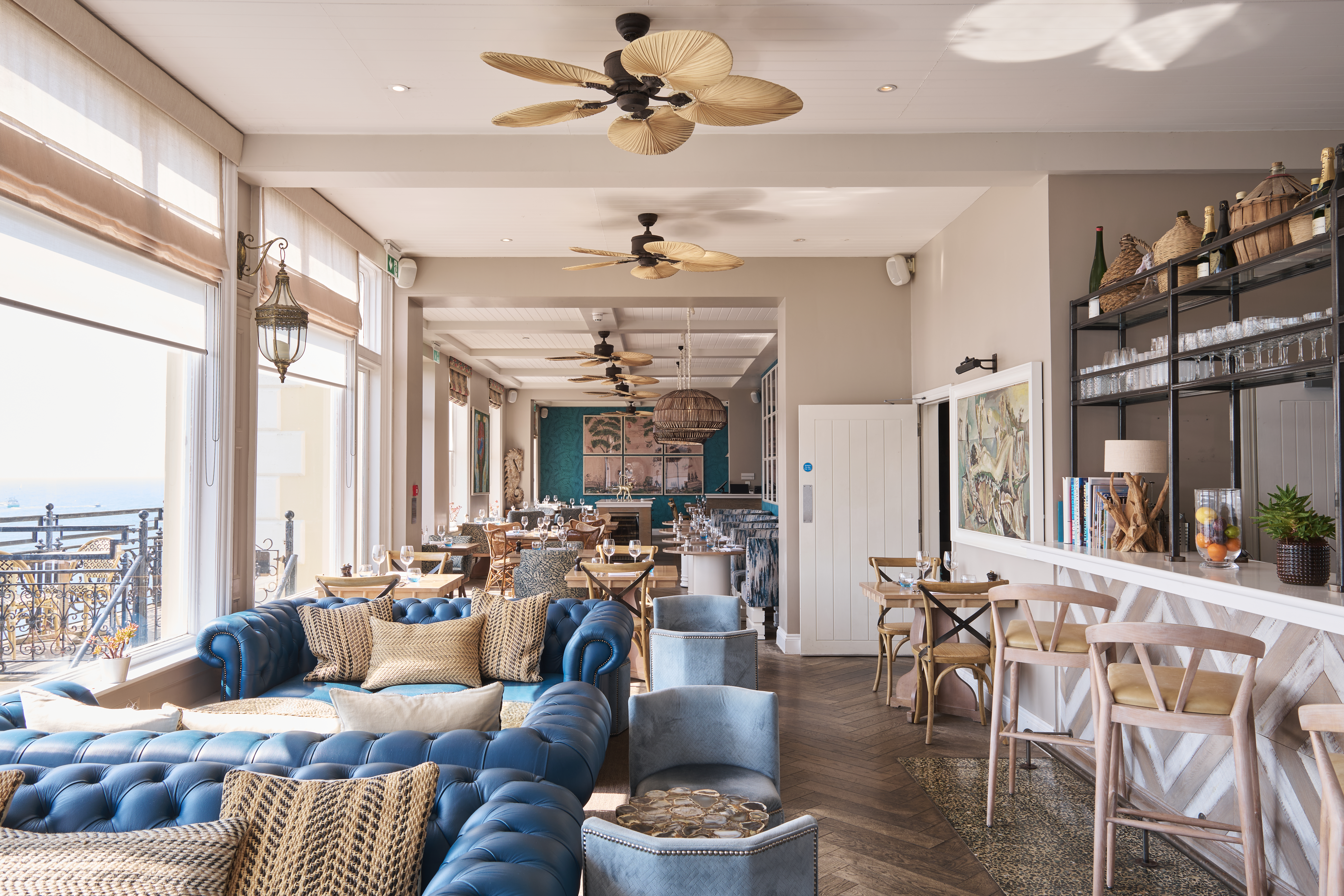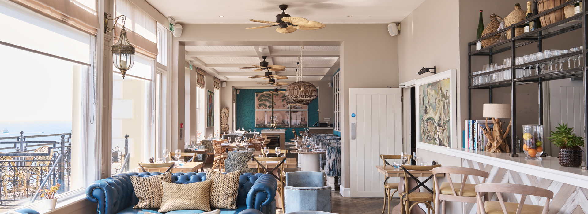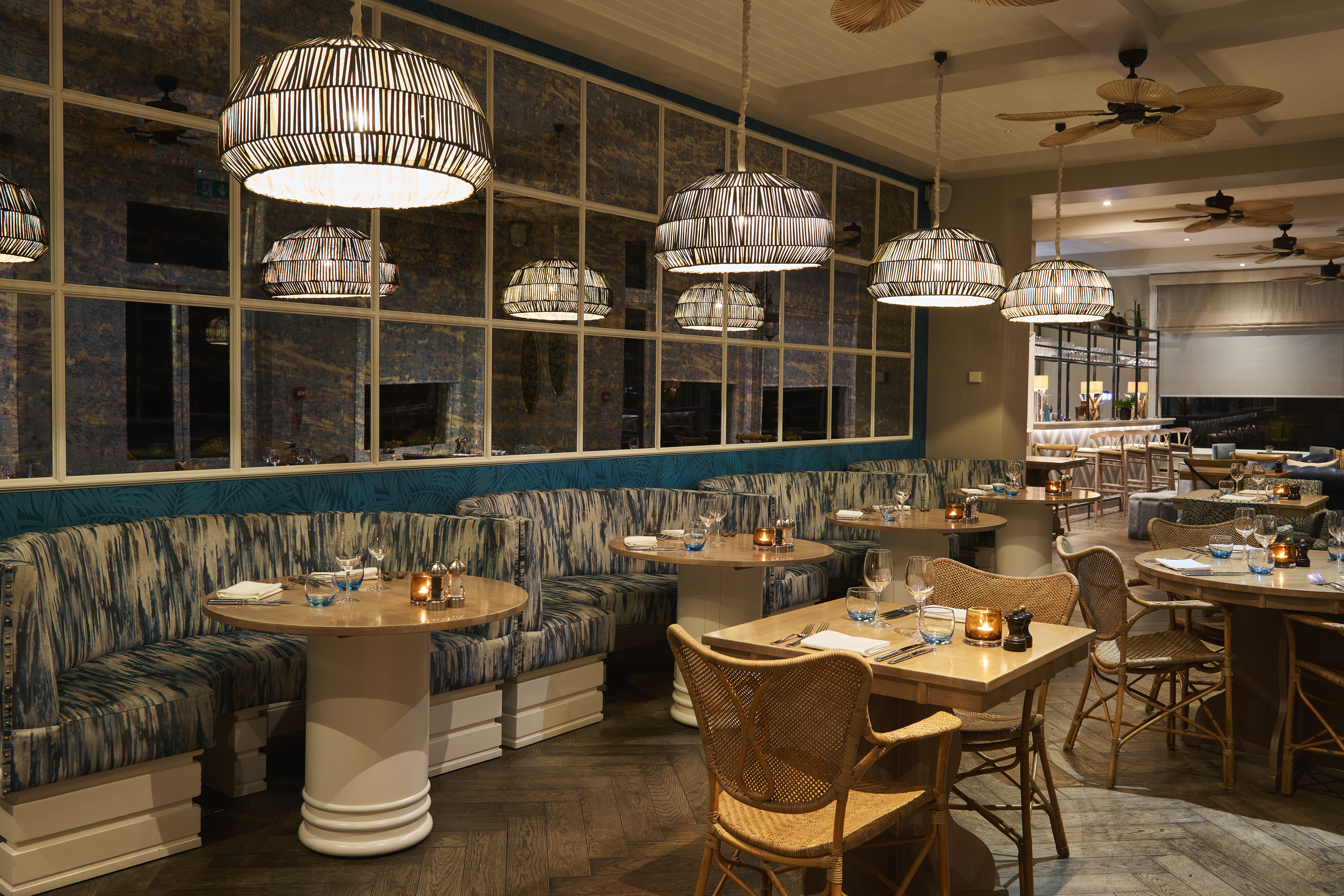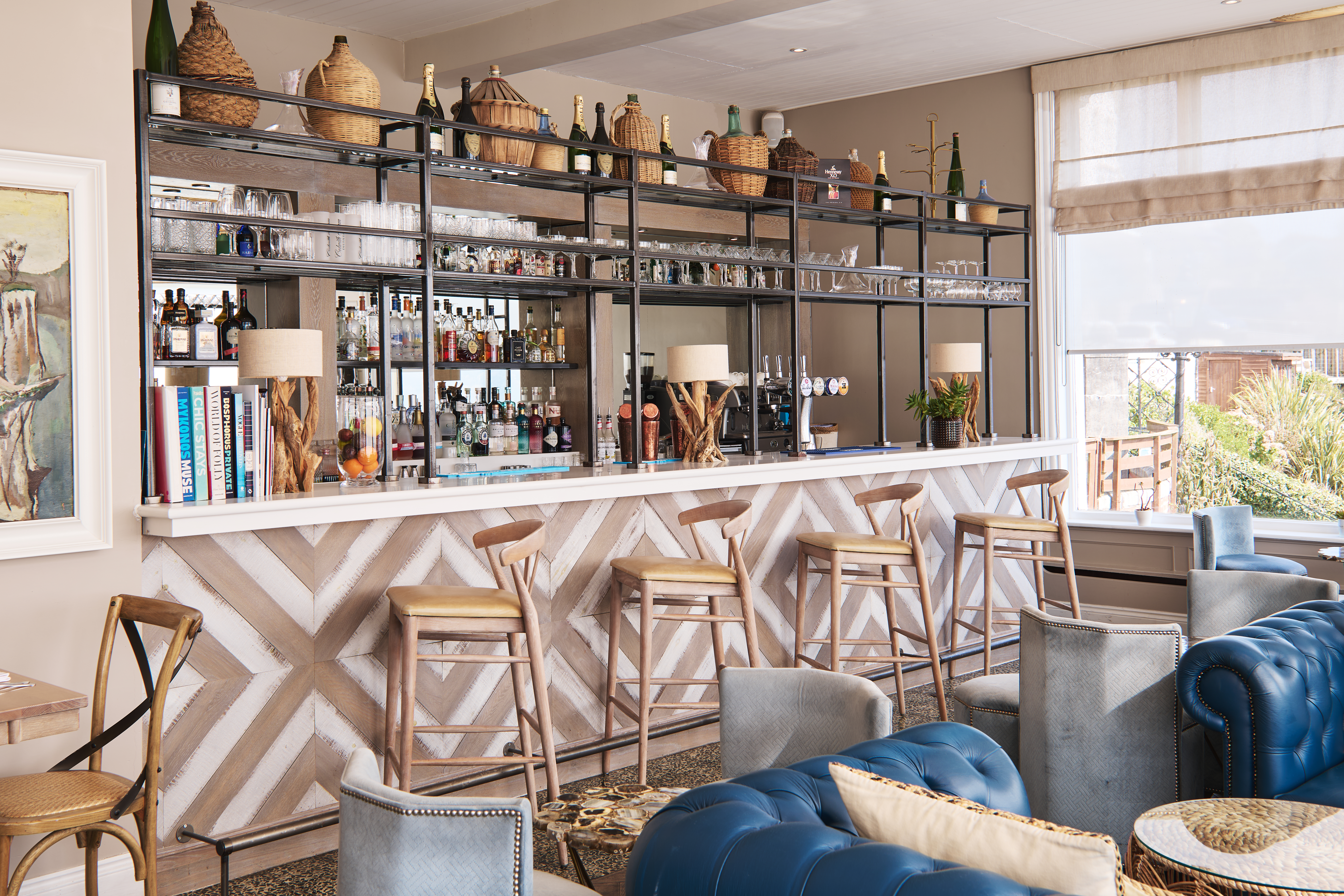 Our atmospheric bar flows seamlessly from restaurant to terrace to mesmerising estuary views. Enjoy creations by our mixologists amid blue leaf-print wallpaper, rattan chairs and plush sofas—a nod to Fowey’s rich history of exotic world travel.