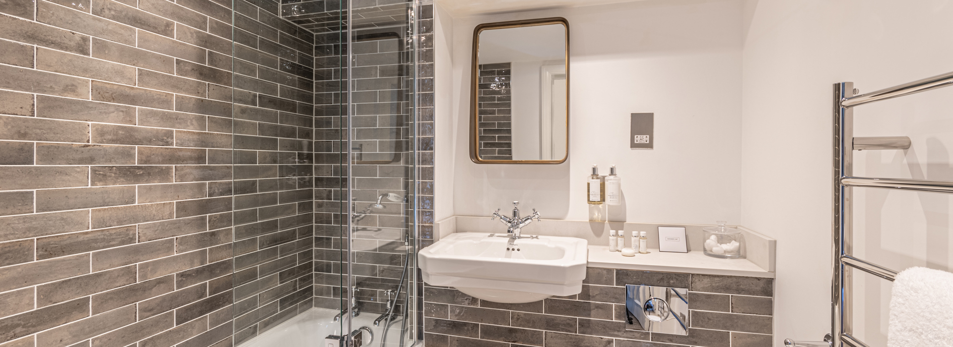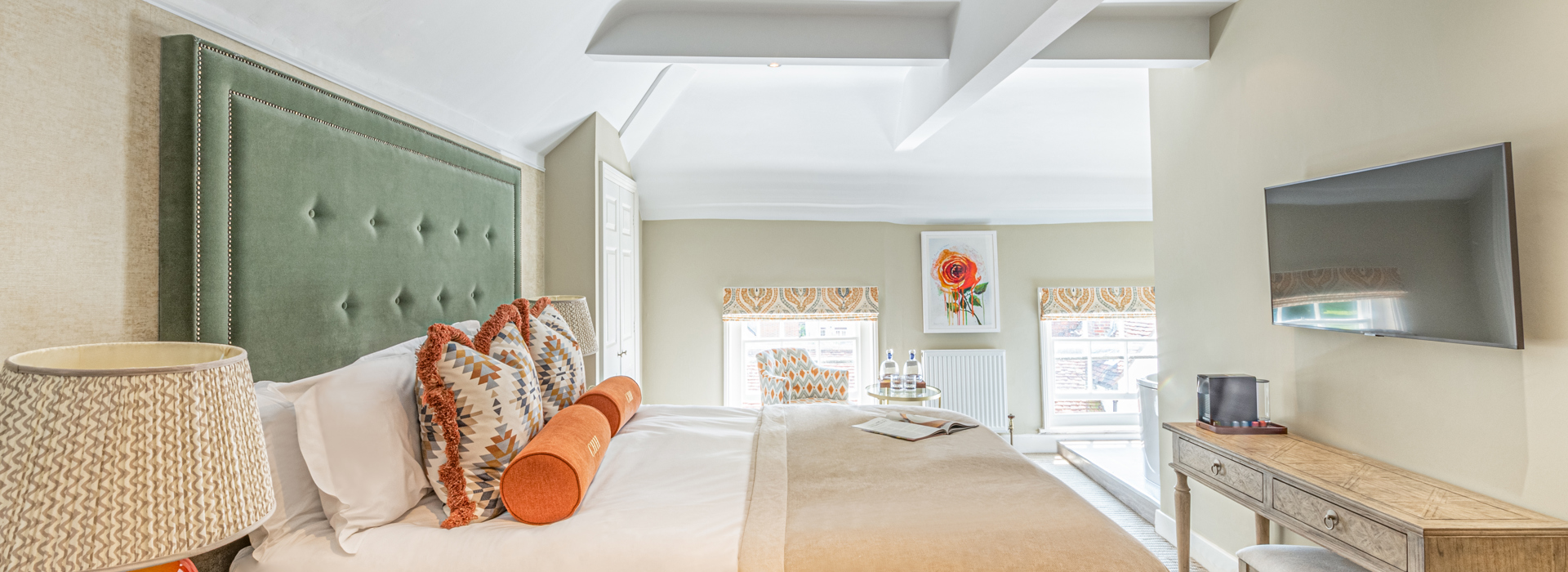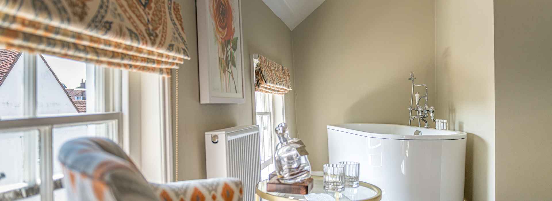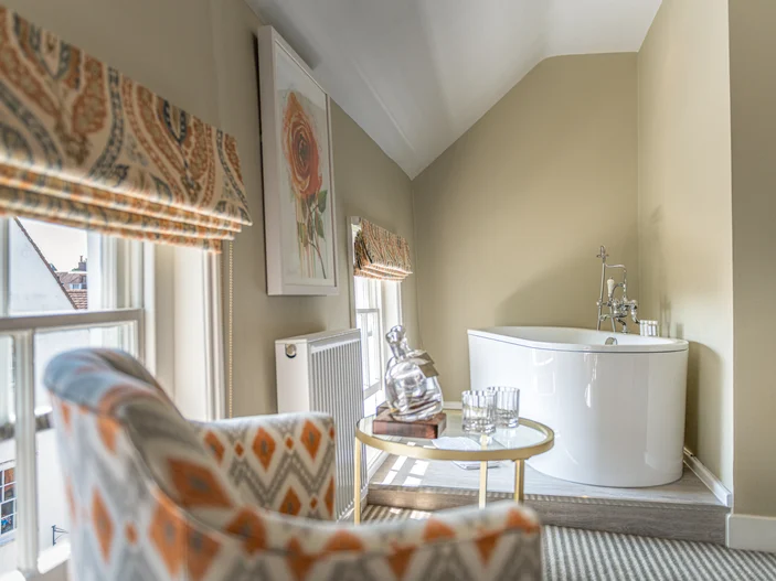 Our spacious Junior Suite has fine views over the historic town centre, a double bed, a separate freestanding bath within the room and a sofa for lounging with complimentary gin in hand—it can also be rolled out seamlessly as an additional bed.